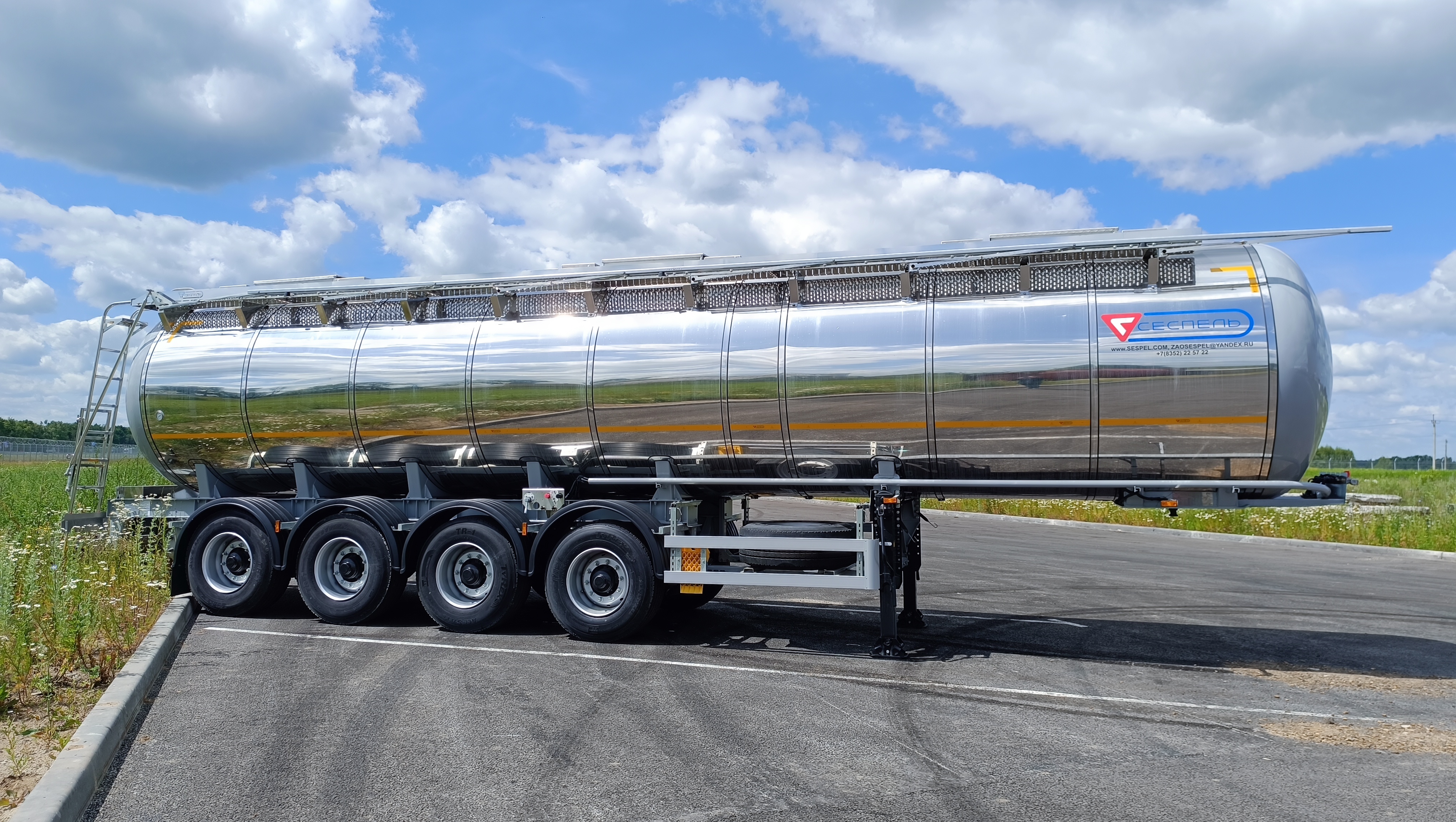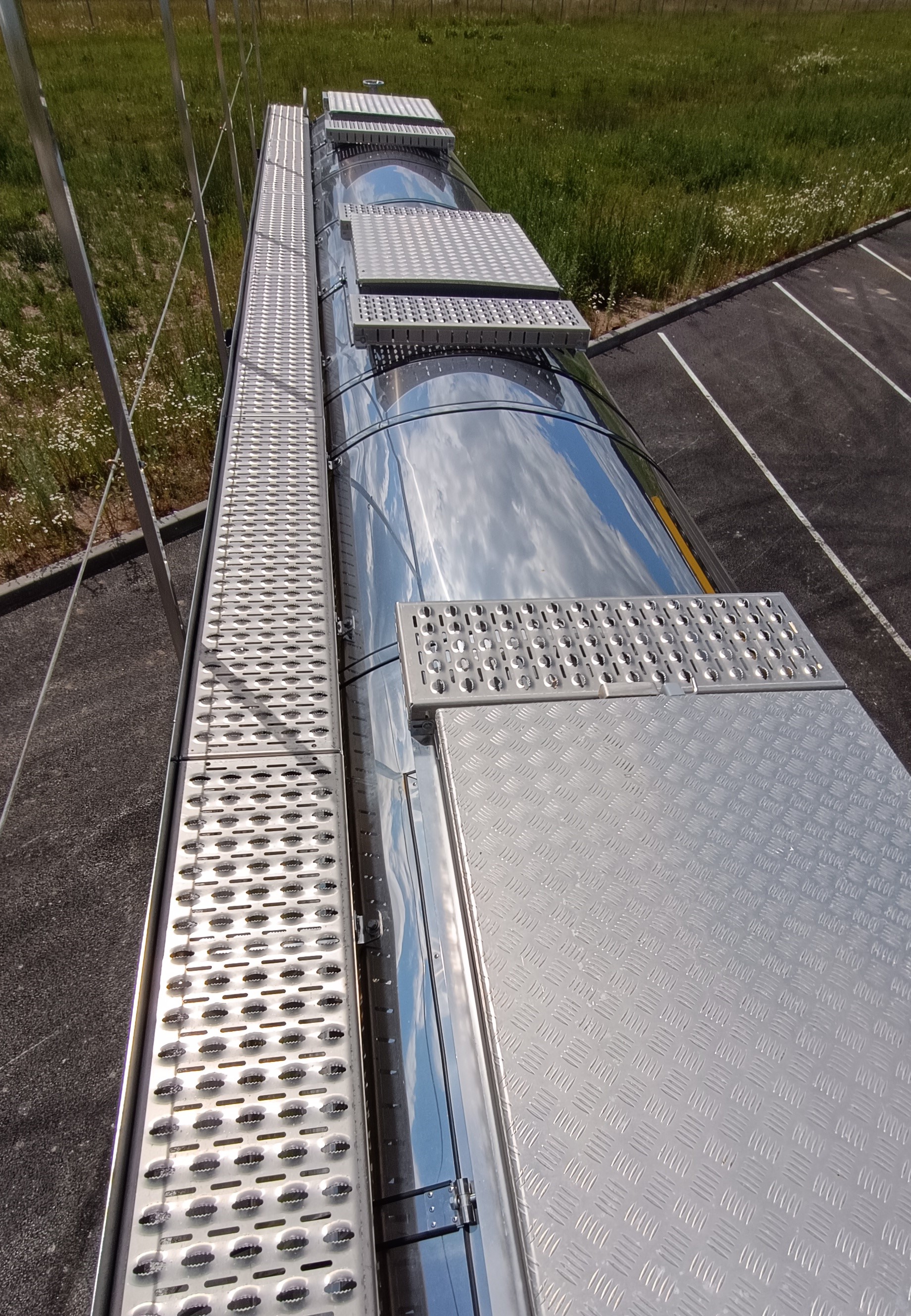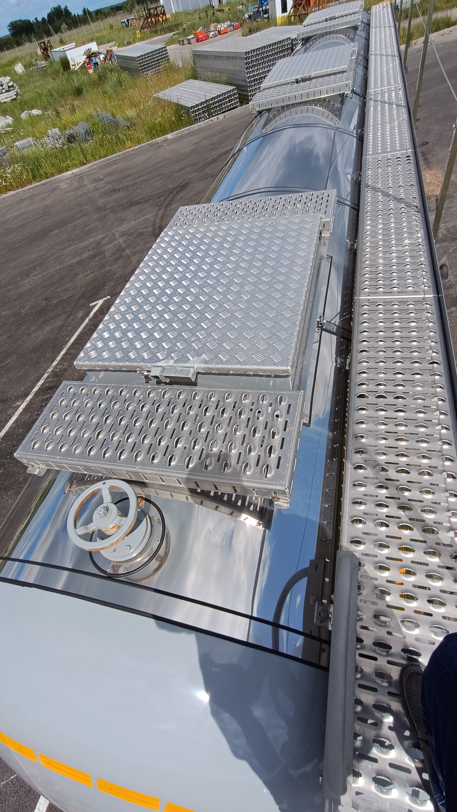 | нескользящая пешеходная дорожка по верху цистерны из алюминиевого сплава; складной поручень высотой 1100 мм, конструктивно исключающий самопроизвольное складывание; рычажный механизм подъема перил от уровня земли; лестница в задней части цистерны со ступенями, исключающими скольжение |