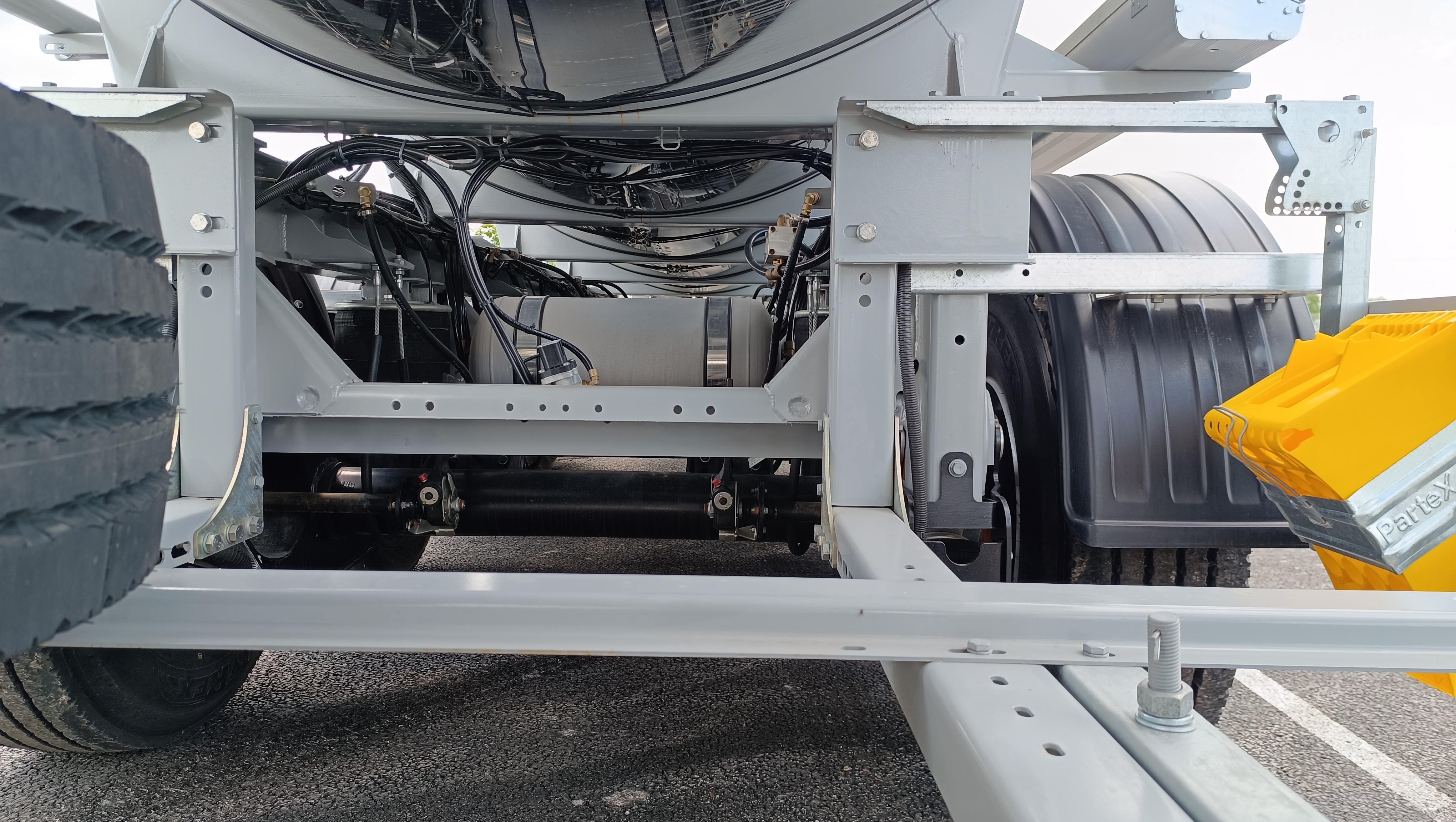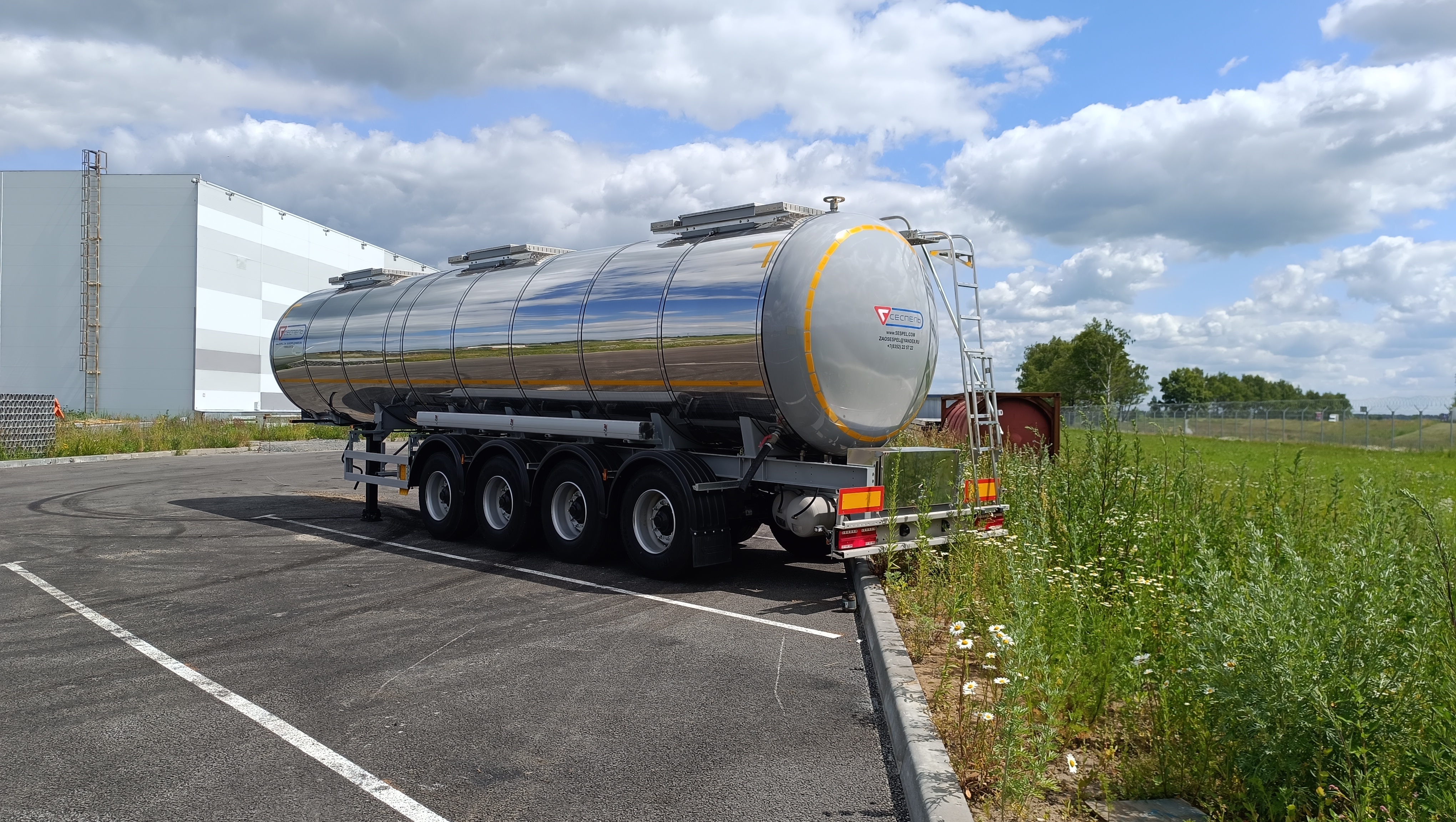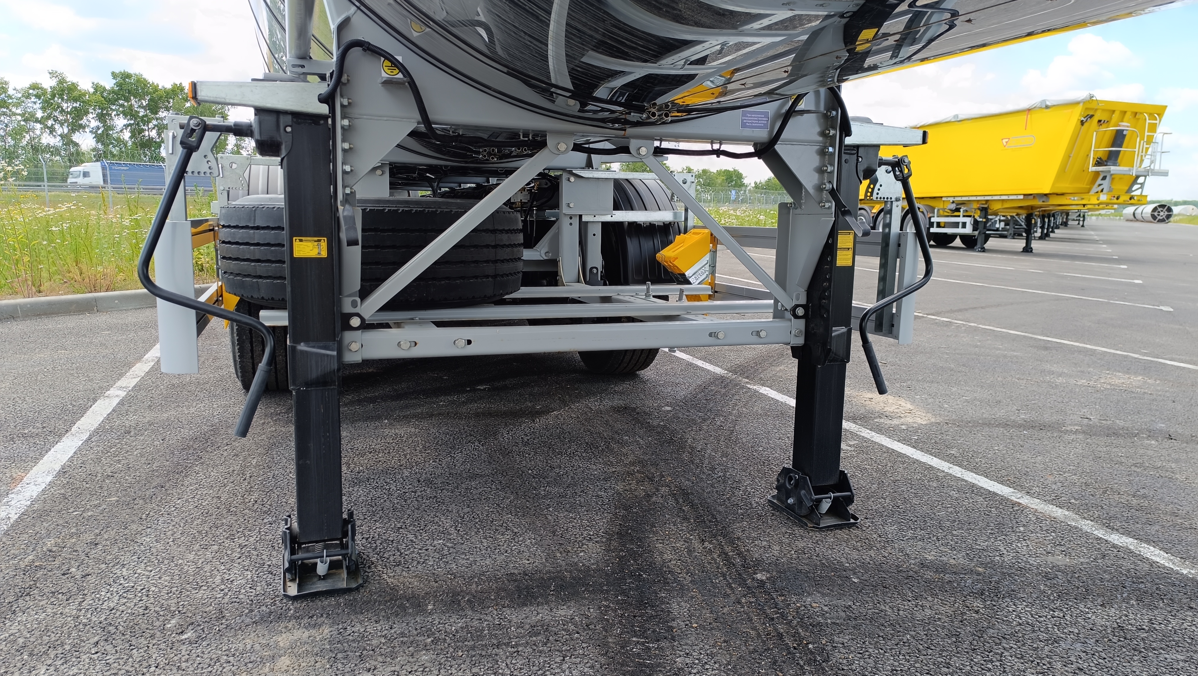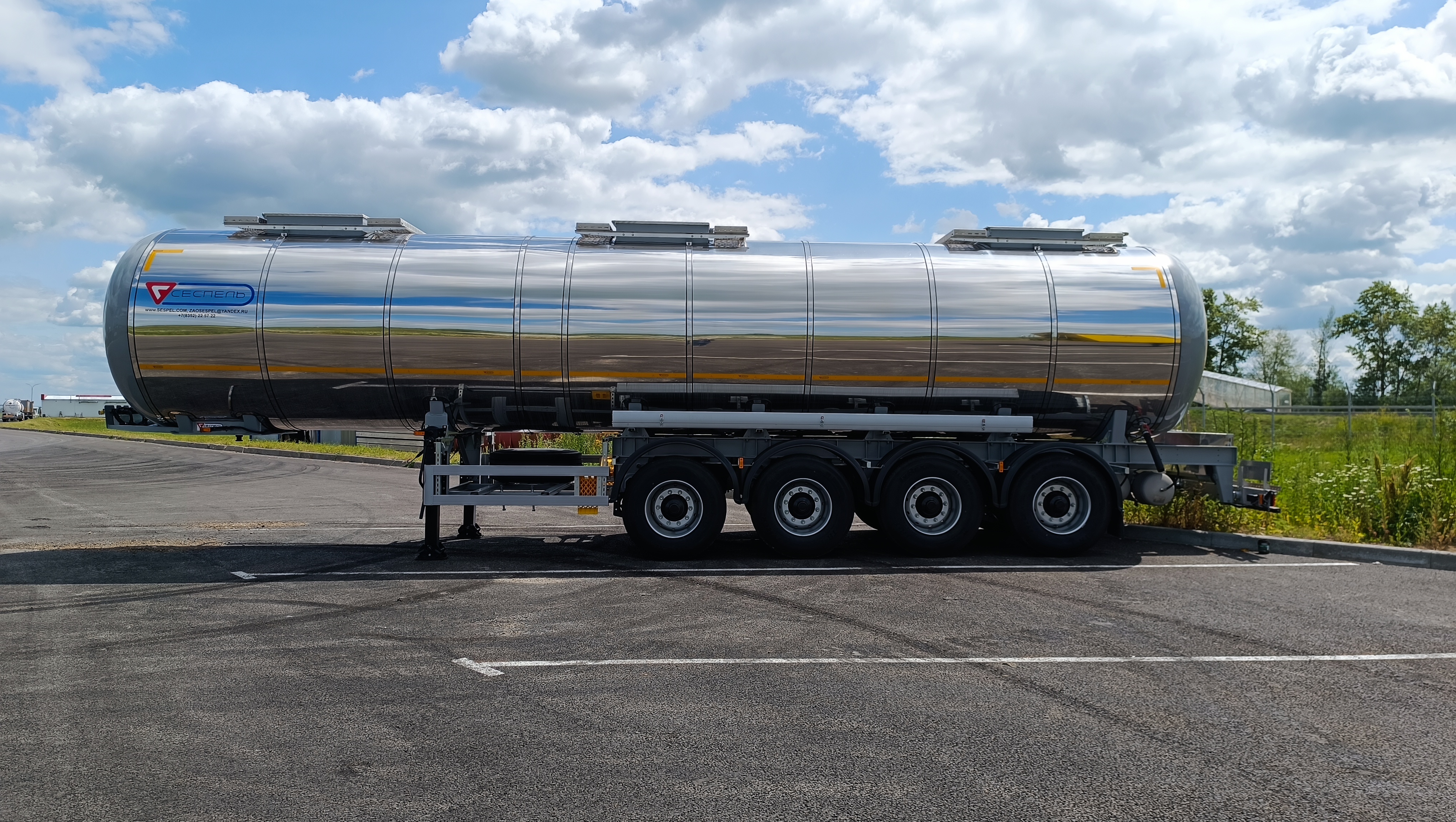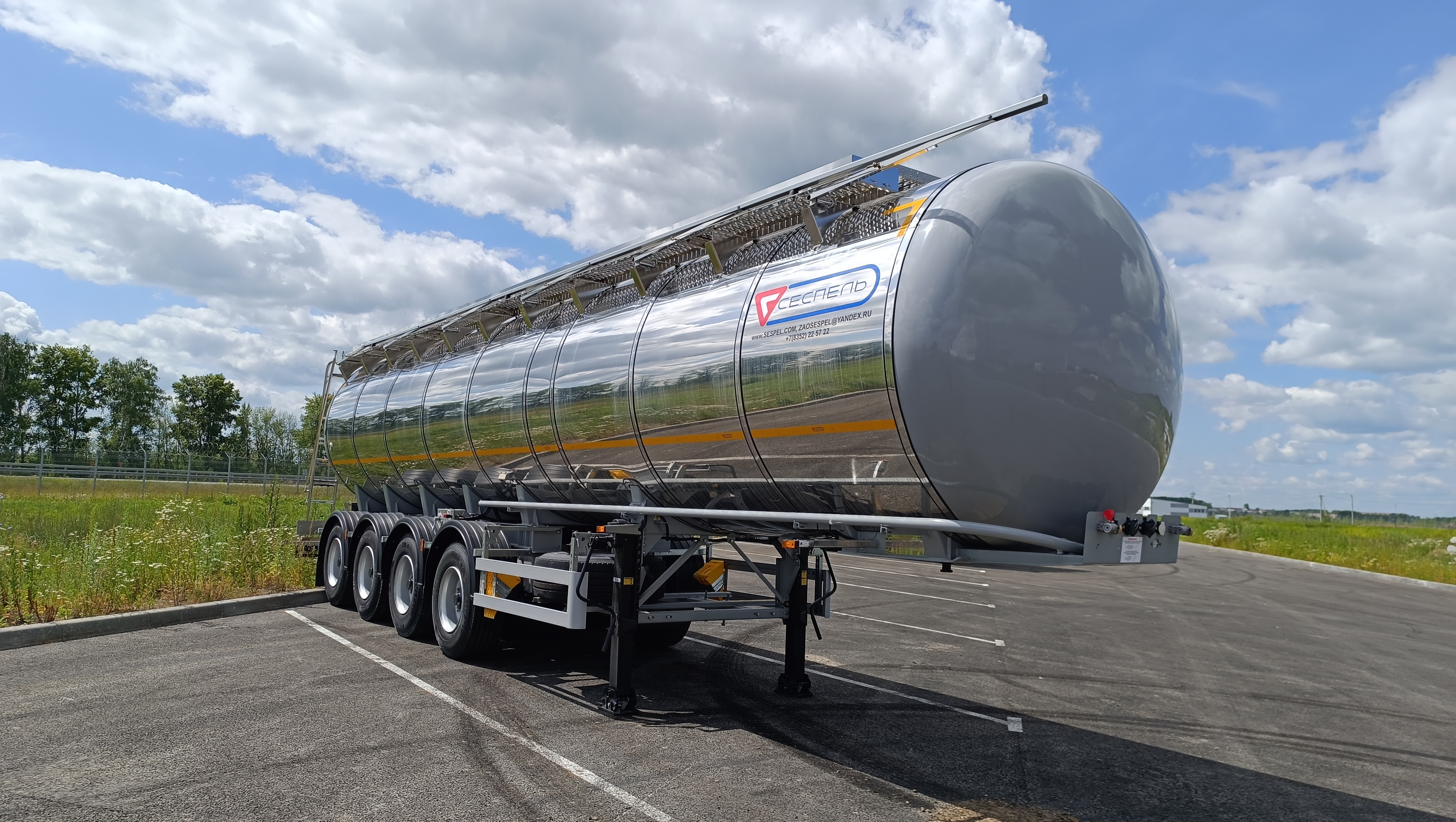 Цистерна имеет 1 отсек с волнорезами. Отсек оснащен горловым кольцом и люком лазом с соответствующей крышкой и донной прокладкой; Сцепной шкворень 2"; стальные механические опоры 2 шт. по 24 тн.; противооткатные упоры 2 шт.; лестница с подъемным поручнем; сдвоенный пенал для рукава разгрузки из ПВХ; быстроразъемные соединения Camlock 4" на сливном рукаве; заднее защитное устройство. Экологическое устройство антипролива и дренажа, 2 слива сзади цистерны – дренажной системы, проходящей через нее; Крепление крышки - болтовое соединение по кругу; Донный клапан с пневмоуправлением 4” в каждом отсеке;