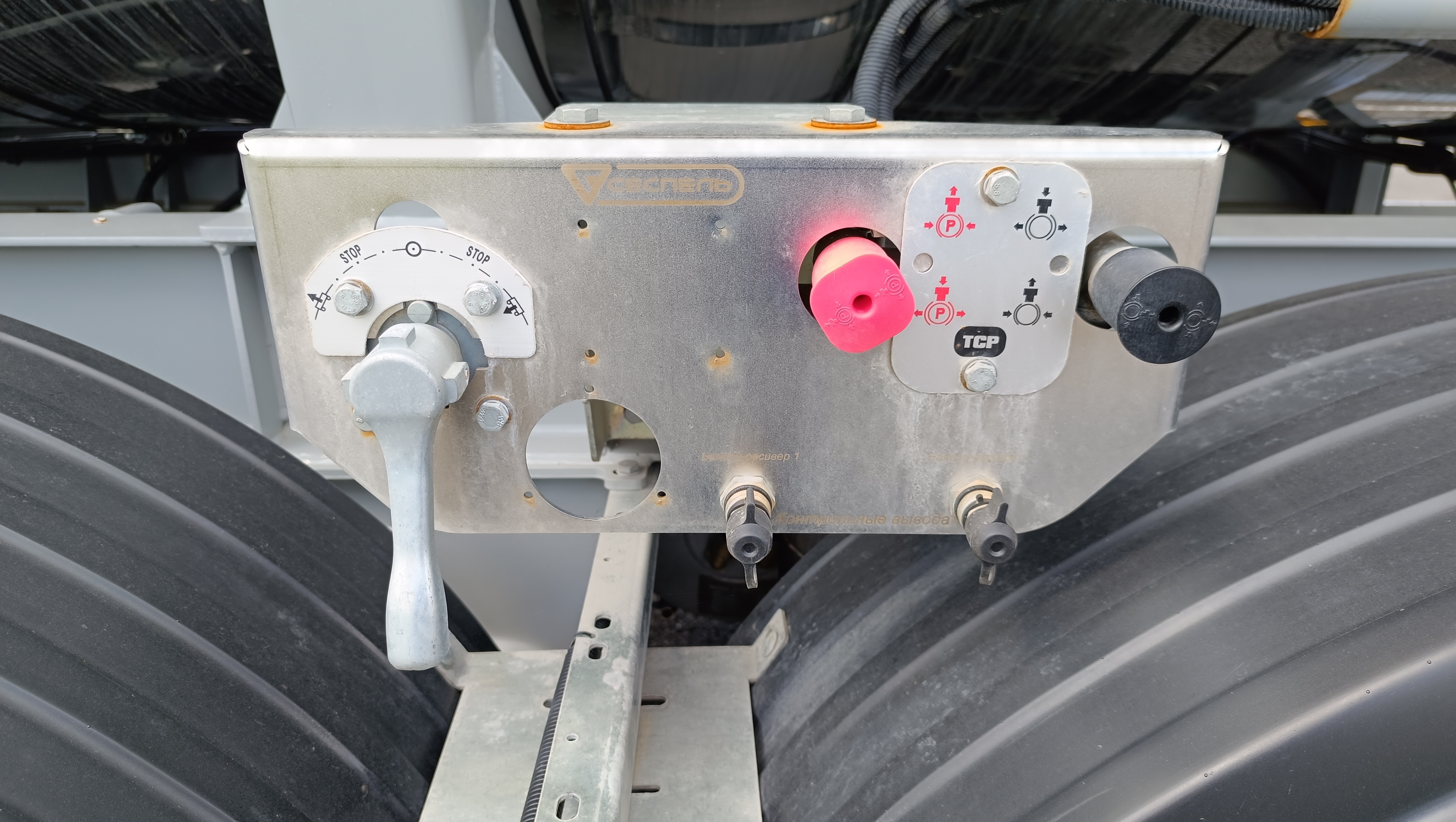 Единый технологический отсек на две стороны, с левой стороны расположено оборудование слива, с правой стороны закреплено запасное колесо |